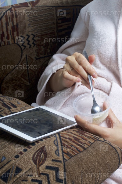 Девушка в домашнем халате ест йогурт