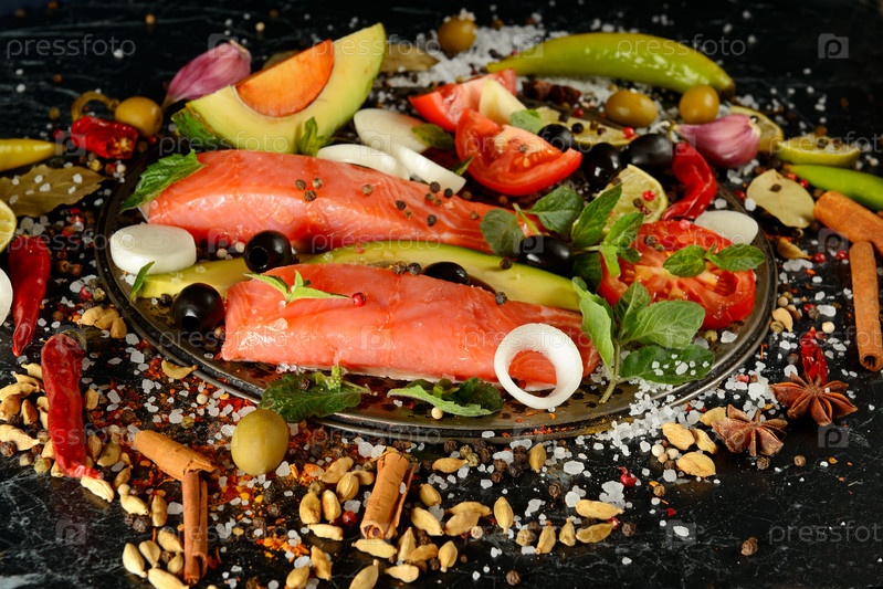 Филе лосося и специи на темном фоне