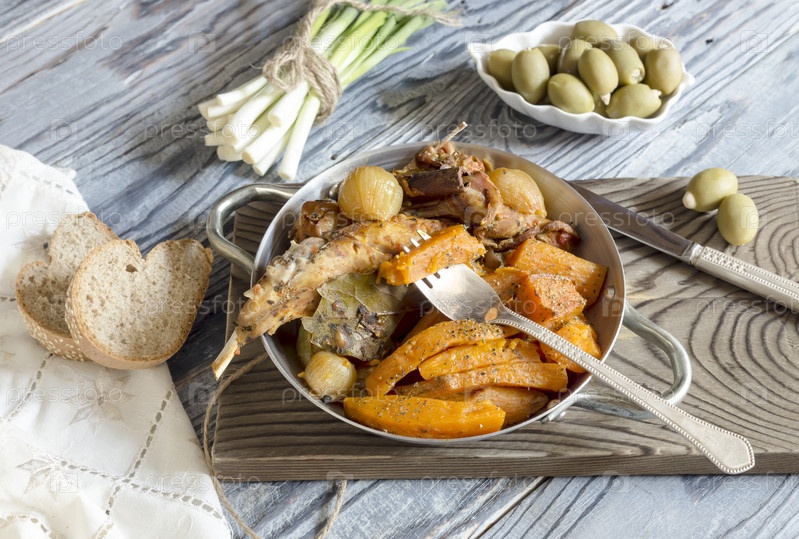 Тушеный кролик со сладким картофелем, оливками, зеленым луком