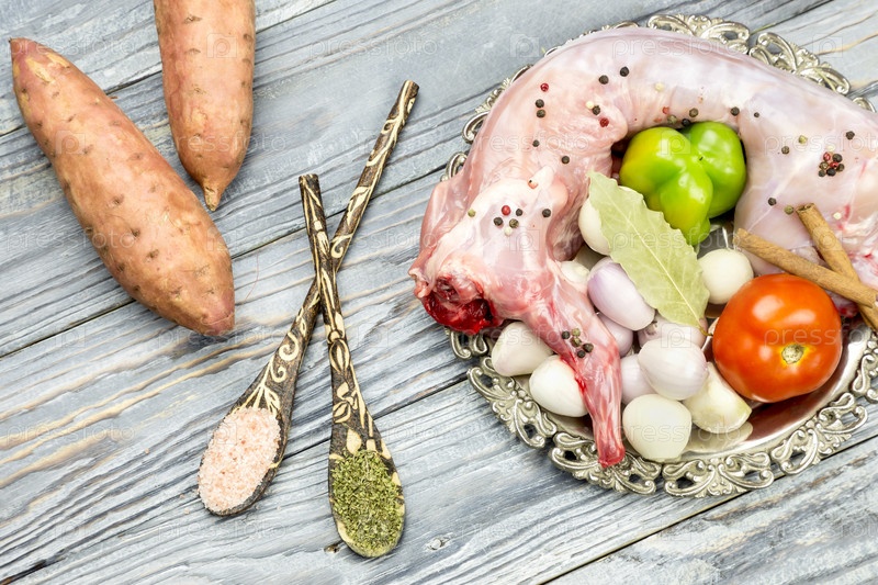 Целый, сырой кролик с овощами и специями