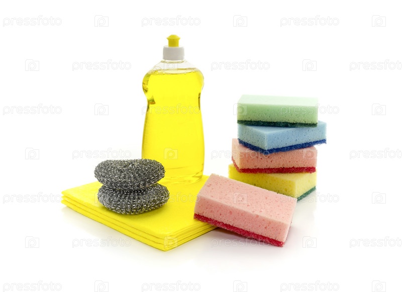 Различные кухонные мочалки и моющее средство