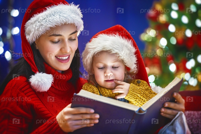 Мать читает книгу на Рождество