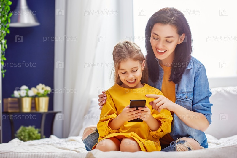 Мама и дочь играют с телефоном