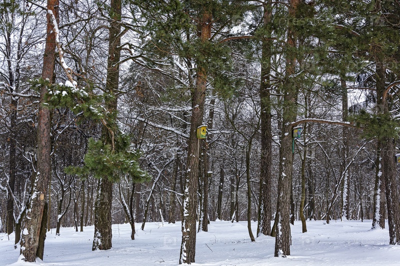 Скворечники для птиц на деревьях в зимнем лесу