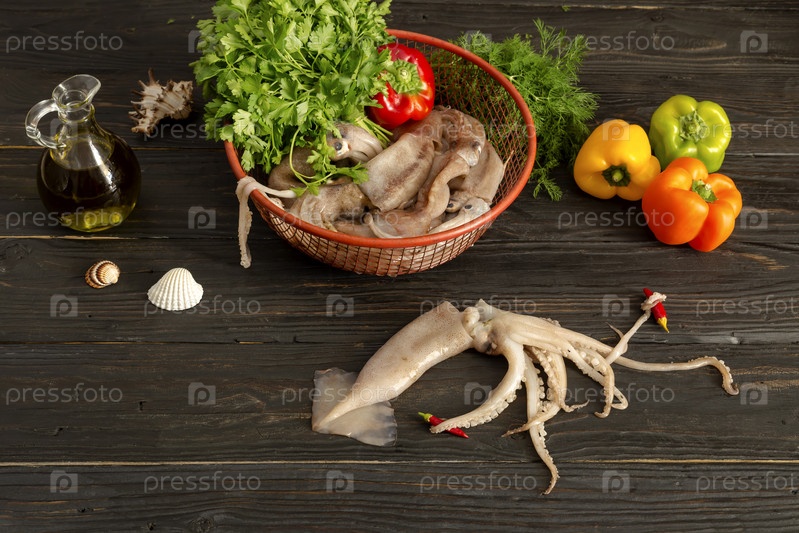 Сырые кальмары, оливковое масло и овощи на темном деревянном столе