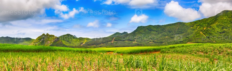 Сахарный тростник и горы. Маврикий. Панорама