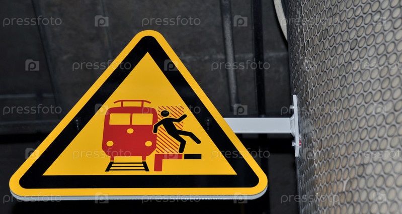 Желтый знак на железнодорожной платформе, оповещение о приближении поезда