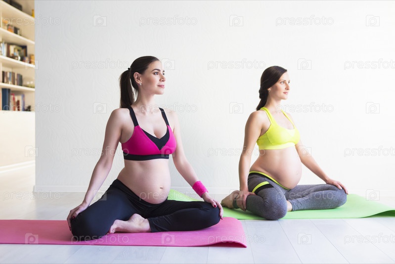 Две молодые беременные женщины делают упражнения фитнеса