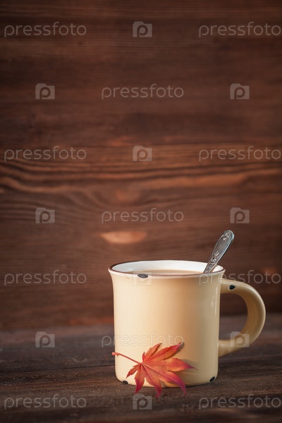 Чашка кофе с кленовым листом на деревянном фоне