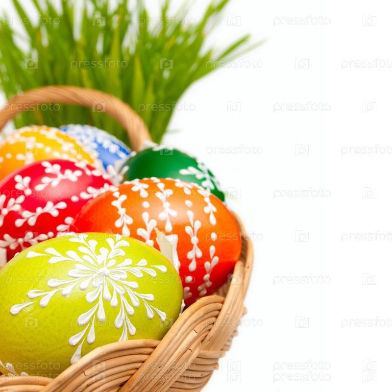 Пасхальные яйца в корзине, изолированы на белом фоне