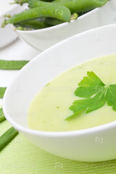 Зеленый сливочный гороховый суп в белой чаше