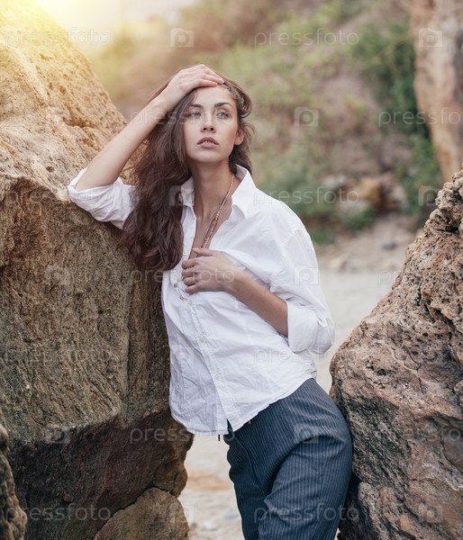 Девушка возле большого камня у моря