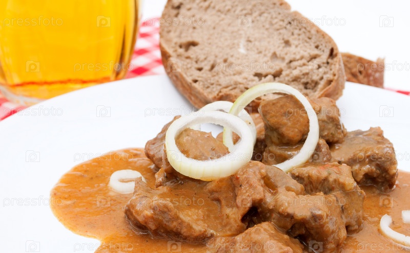 Гуляш из говядины с кусочком хлеба и кружкой пива
