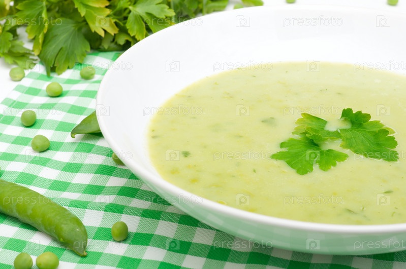 Зеленый сливочный гороховый суп в белой чаше