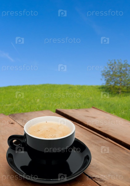 Чашка кофе со сливками на деревянном столе на открытом воздухе