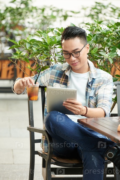 Молодой человек в очках для чтения книги