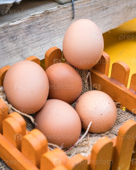 Коричневые яйца в деревянной корзине
