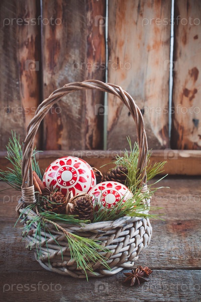 Елочные игрушки, шишки и орехи в корзине