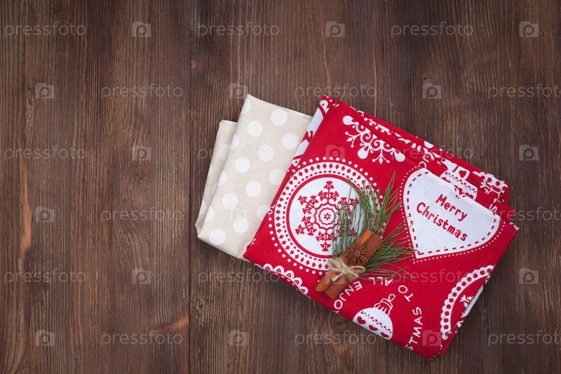 Кухонные рождественские полотенца на деревянном фоне