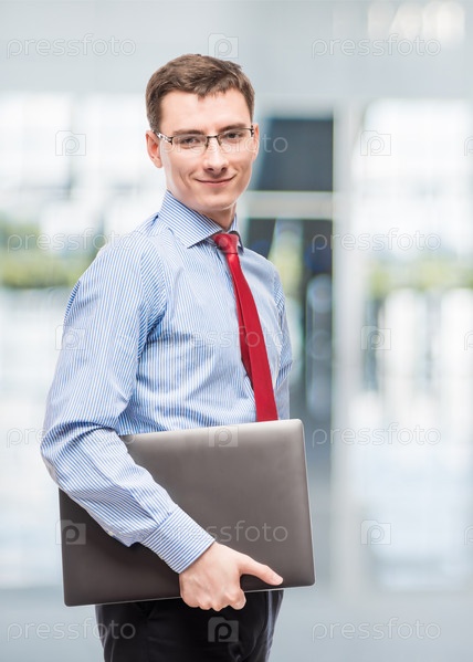 Портрет молодого успешного бухгалтера с ноутбуком