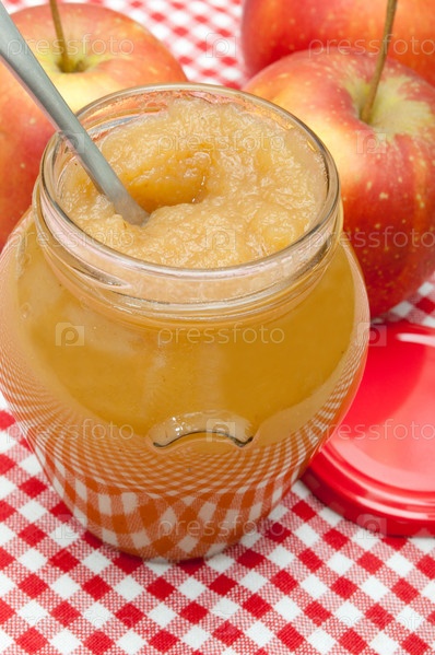 Банка яблочного джема и яблоки на столе