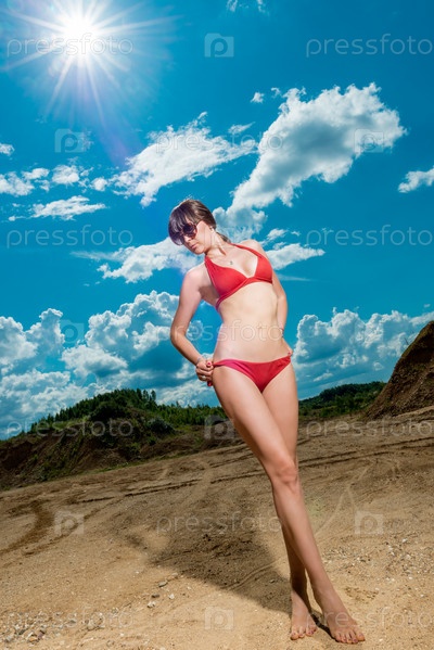 Брюнетка в красном бикини на солнечный день в песке
