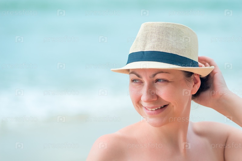 Портрет женщины на пляже в соломенной шляпе