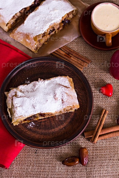 Яблочный штрудель, чашка кофе и сердца