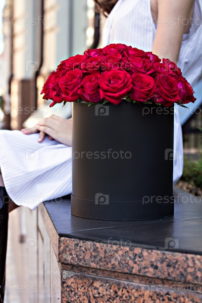 Букет из красных роз в коробке в руках девушки