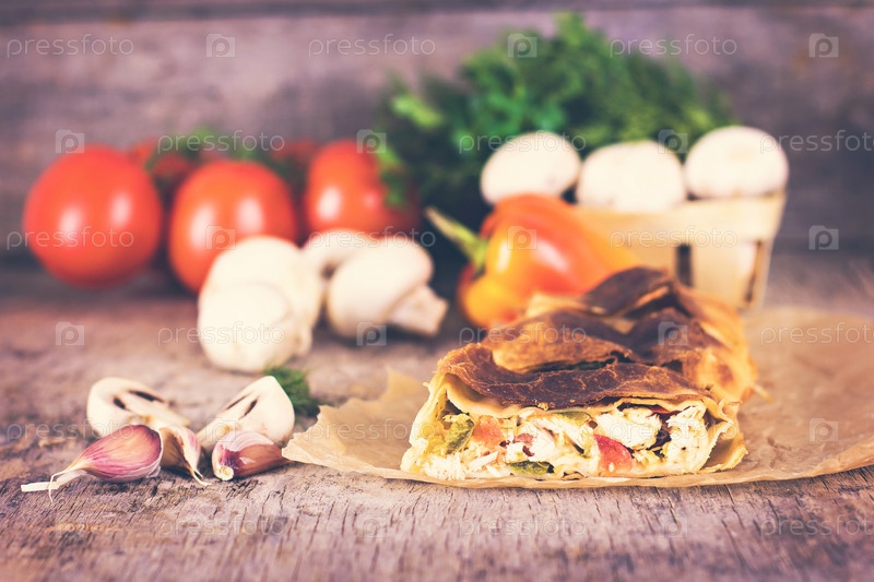 Самодельный рулет с курицей, грибами, сыром и овощами