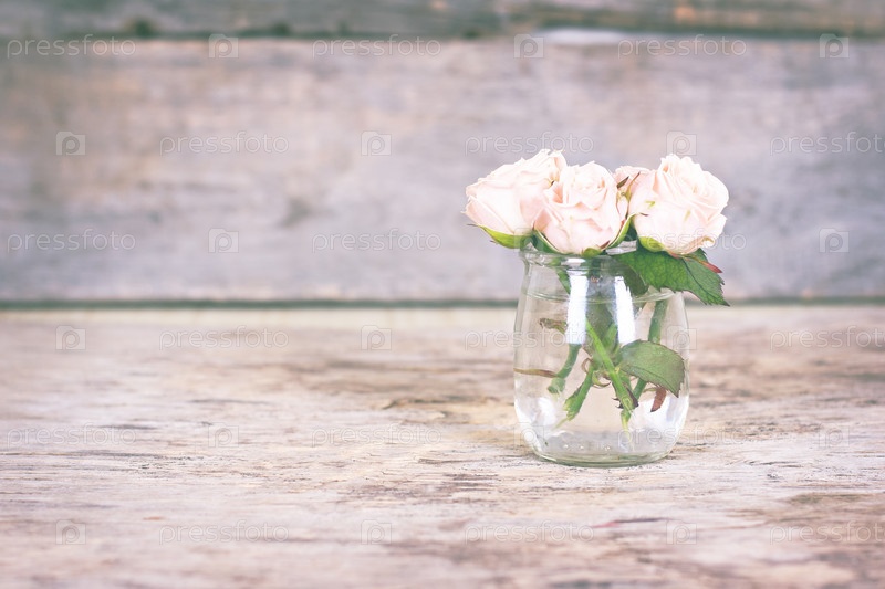 Небольшой букет из розовых роз на деревянном фоне