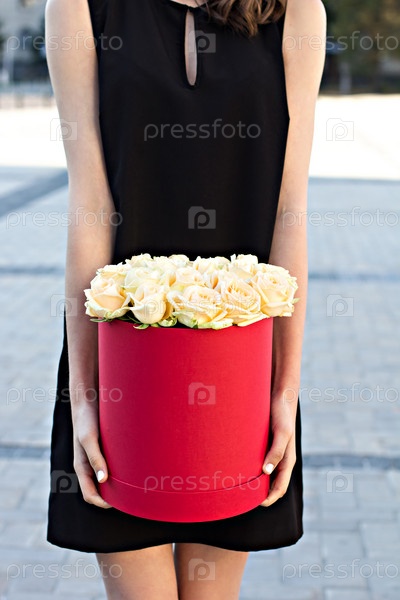 Букет из белых роз в коробке в руках девушки
