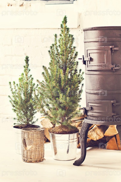 Черная печь, дрова, елка и свечи
