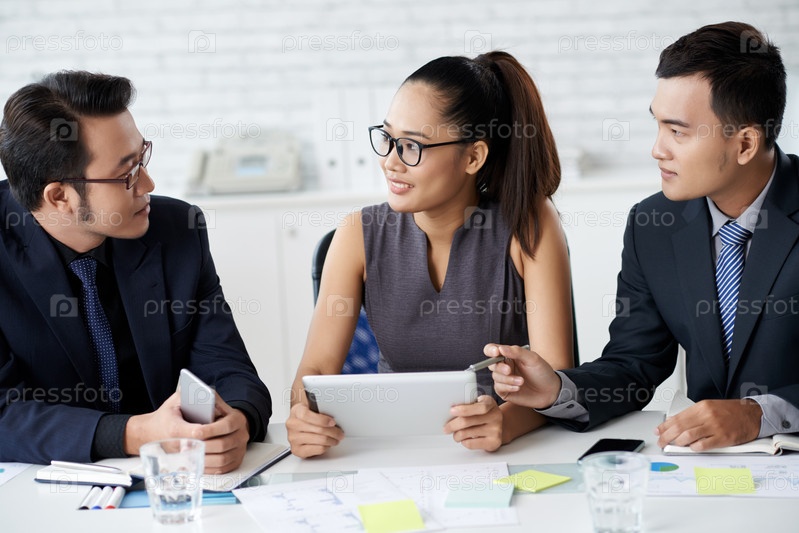 Азиатская бизнес-команда обсуждает идеи на мозговом штурме