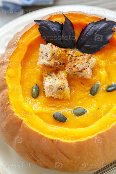 Тыквенный суп с гренками и фиолетовым базиликом