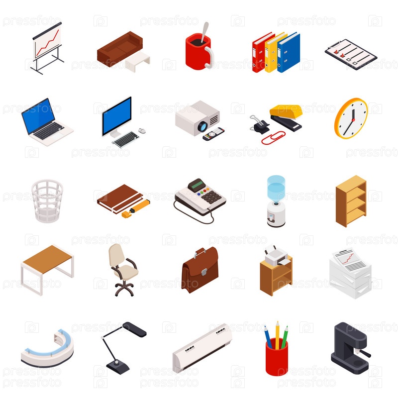 Изометрический набор иконок на тему офисного оборудования