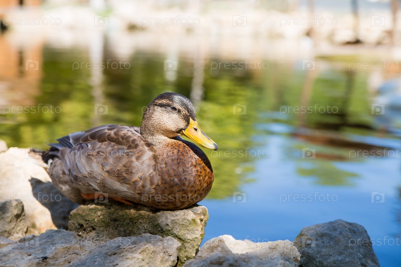 Кряква на каменном берегу озера