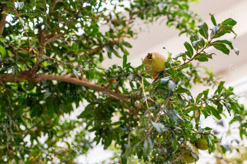 Зеленый гранат растет на ветке дерева