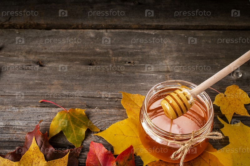 Мед и осенние листья на деревянном фоне