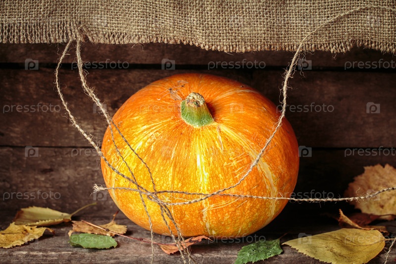 Тыквы и осенние листья на деревянном фоне