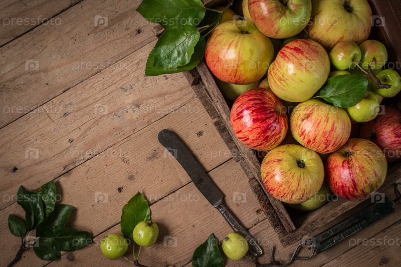 Ящик со свежими яблоками на старом деревянном столе