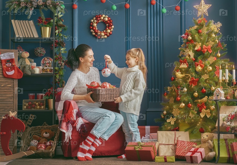 Мама и дочь украшают елку на Рождество
