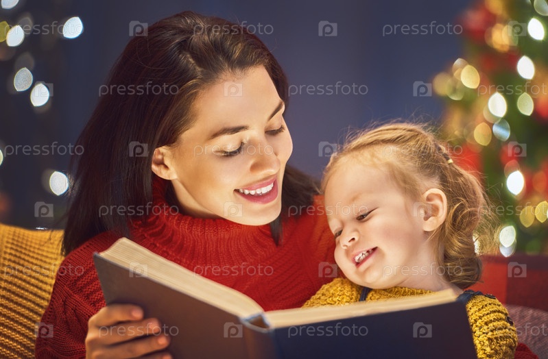 Мать читает книгу на Рождество