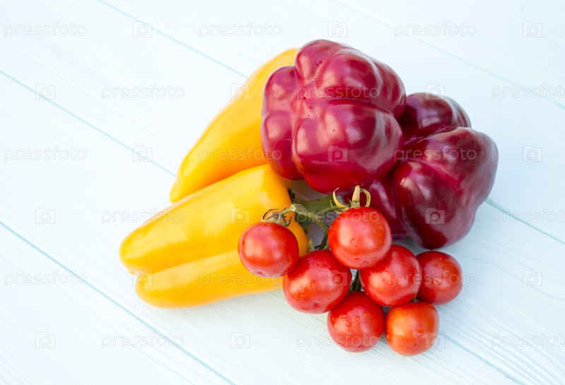 Перец и помидоры на деревянном фоне