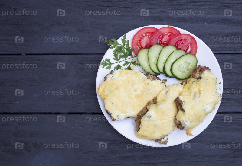 Стейк с овощами на черном фоне
