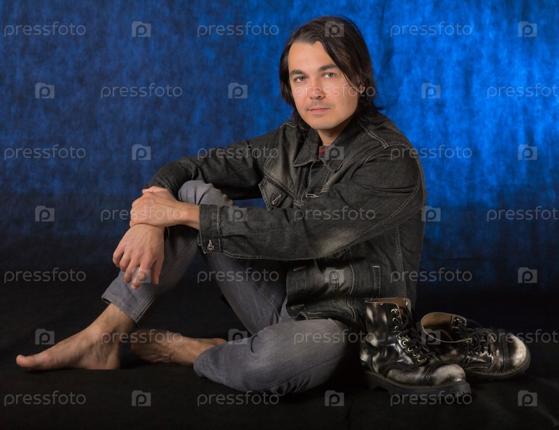 Молодой человек в повседневной одежде сидит босиком на полу в студии