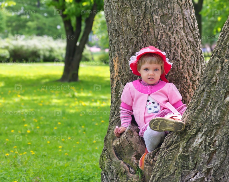 Симпатичная девочка сидит на ветке дерева летом