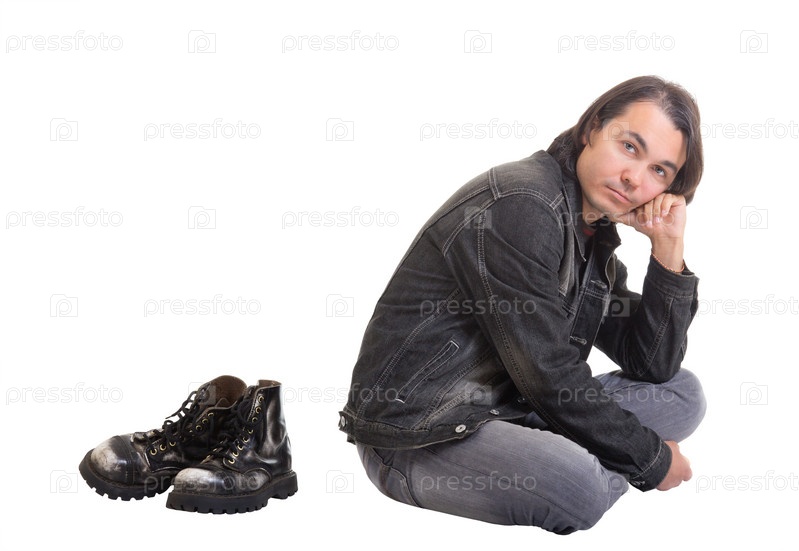 Молодой человек в повседневной одежде сидит босиком, изолированный на белом фоне