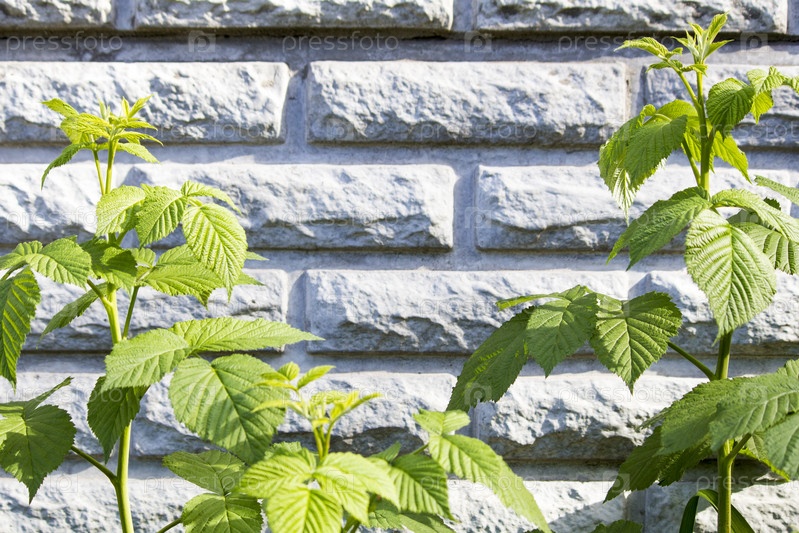 Зеленые ветви на фоне кирпичной стены