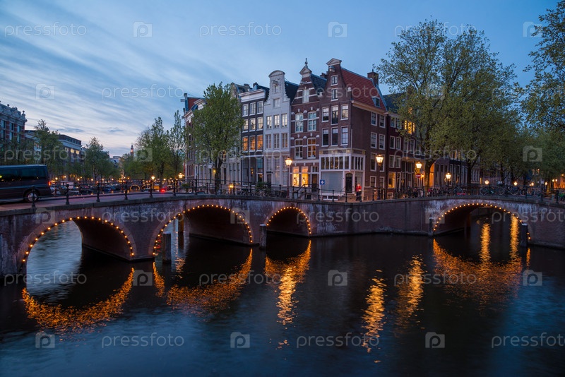 Один из известных каналов Амстердама, Нидерланды в сумерках